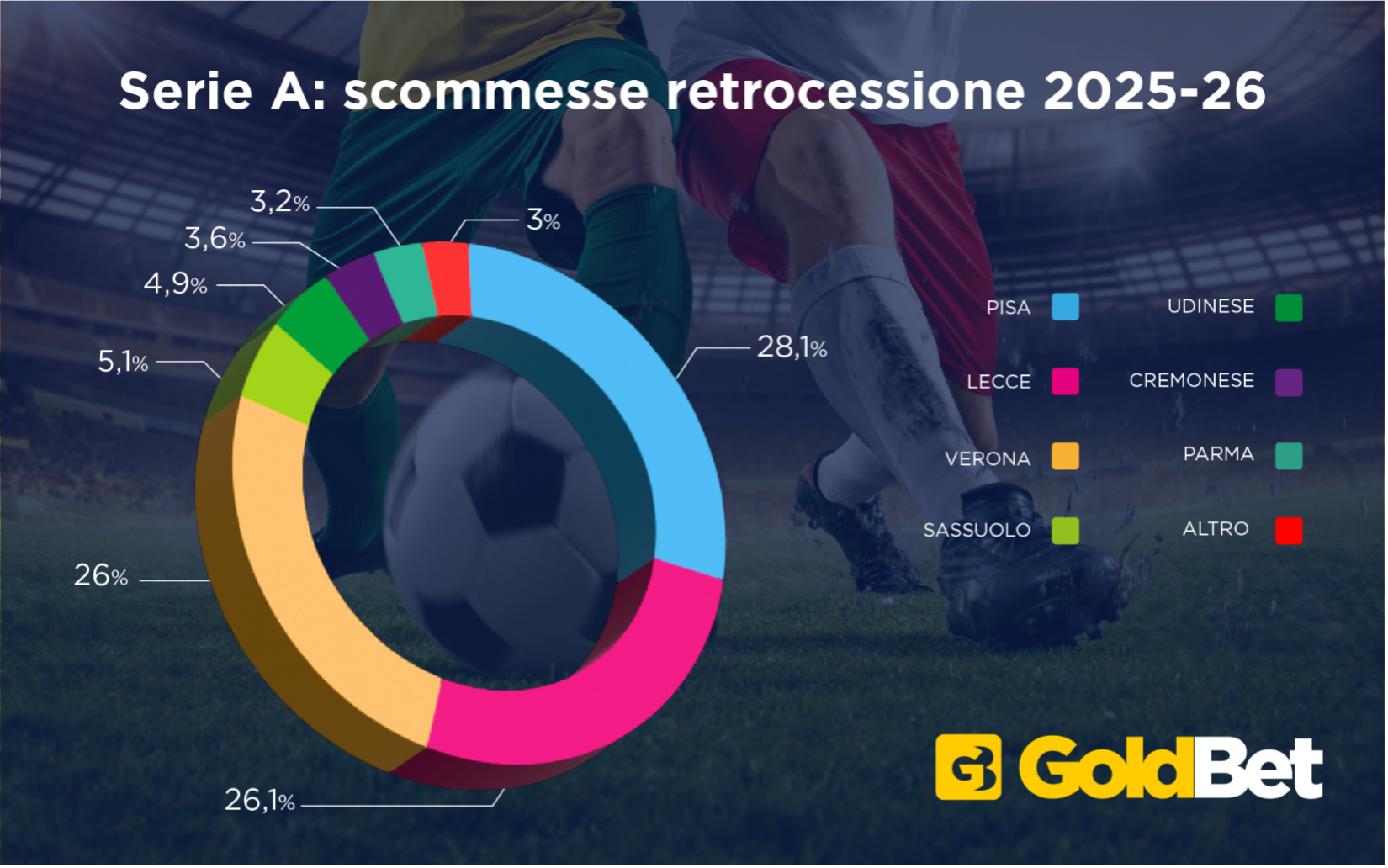 Da ultimo, l’indagine dell’Osservatorio Goldbet accende i riflettori sulla lotta salvezza, sondando il pensiero degli scommettitori su chi scenderà di categoria al termine della stagione. Qui il grosso delle puntate è su Pisa (28,1%), Lecce (26,1%) e Verona (26%).